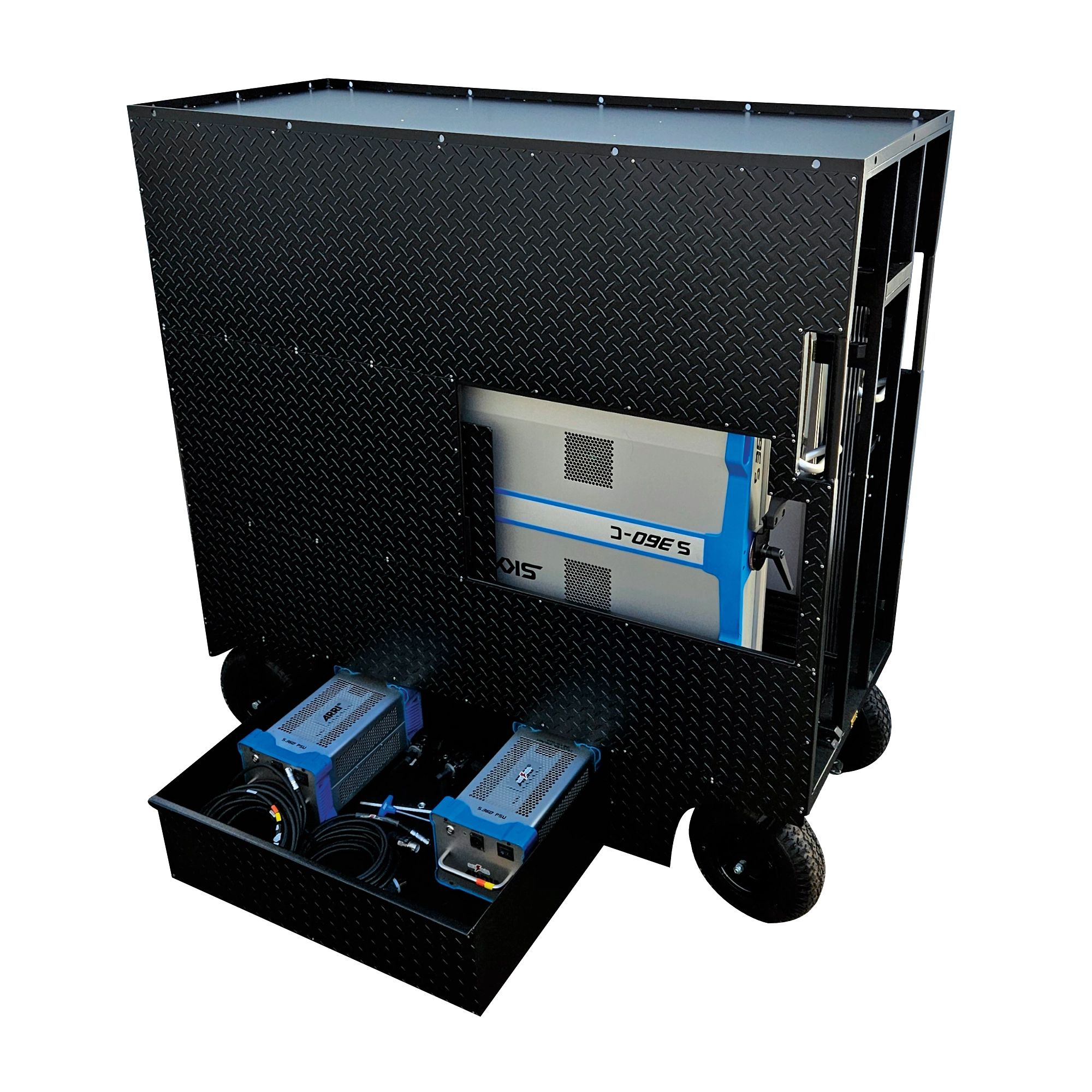 The S360 Cruiser Cart is the ultimate transport solution for ARRI Skypanel S360 LED lights. Designed for professionals, this cart features slide-in side doors, 6 spacious compartments, and an aluminum drawer for secure storage. Built with 12″ dually knobby pneumatic wheels, powder-coated finish, and aluminum diamond plate fenders, it’s perfect for studio or on-location use. Keep your Skypanels and accessories organized, protected, and ready for action!